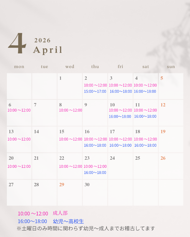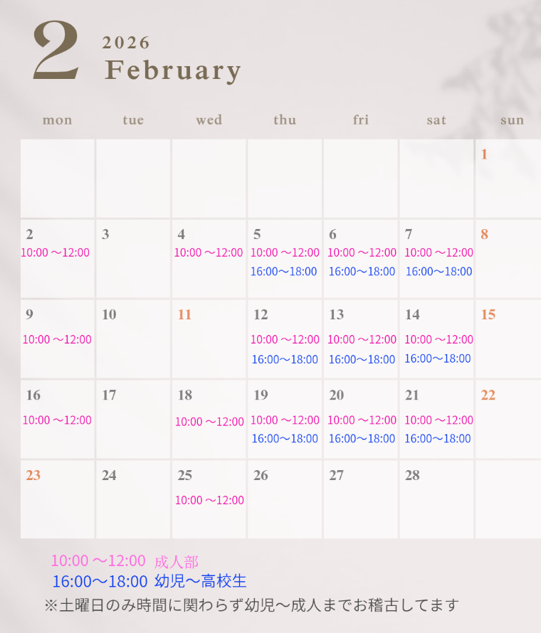 | レッスン日 | 月 | 火 | 水 | 木 | 金 | 土 | 日 |